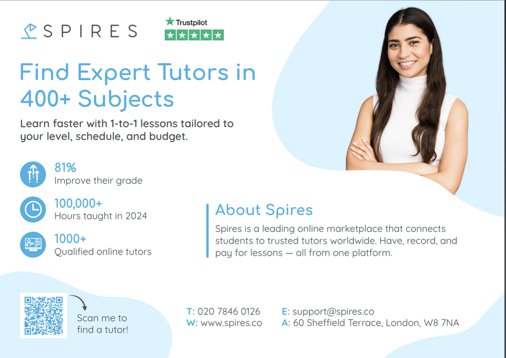 Spires is a premier online tutoring marketplace connecting students and expert tutors worldwide. We support 400+ subjects at every level — Key Stage 3, GCSE/IGCSE, A level/IB, university admissions, undergraduate/Master’s/PhD, and a wide range of postgraduate and professional qualifications (e.g., CFA, accountancy, law, STEM, and specialist entrance tests).